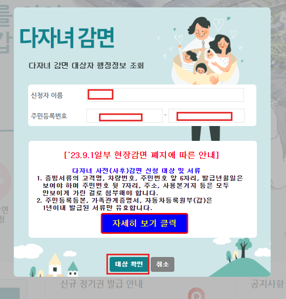 다음 화면에서 이름, 주민번호를 누른 후, 아래 [대상확인] 버튼을 누르면 감면혜택을 받을 수 있는지 여부가 확인됩니다. 대상이 확인되었다는 메시지가 표출되면 차량번호, 휴대폰 번호 등을 적고 위에 언급한 필요서류를 업로드합니다. 다 되었으면 아래 [감면신청]을 누릅니다.