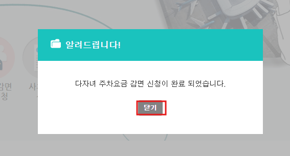 위의 해당 페이지로 접속하면 왼쪽과 같은 메인화면에서 중간에 있는 [다자녀감면 사전신청] 버튼을 누릅니다. 그럼 오른쪽과 같은 팝업이 표시되는데 여기서 아래 체크박스에 체크 후, [감면신청]을 선택합니다.