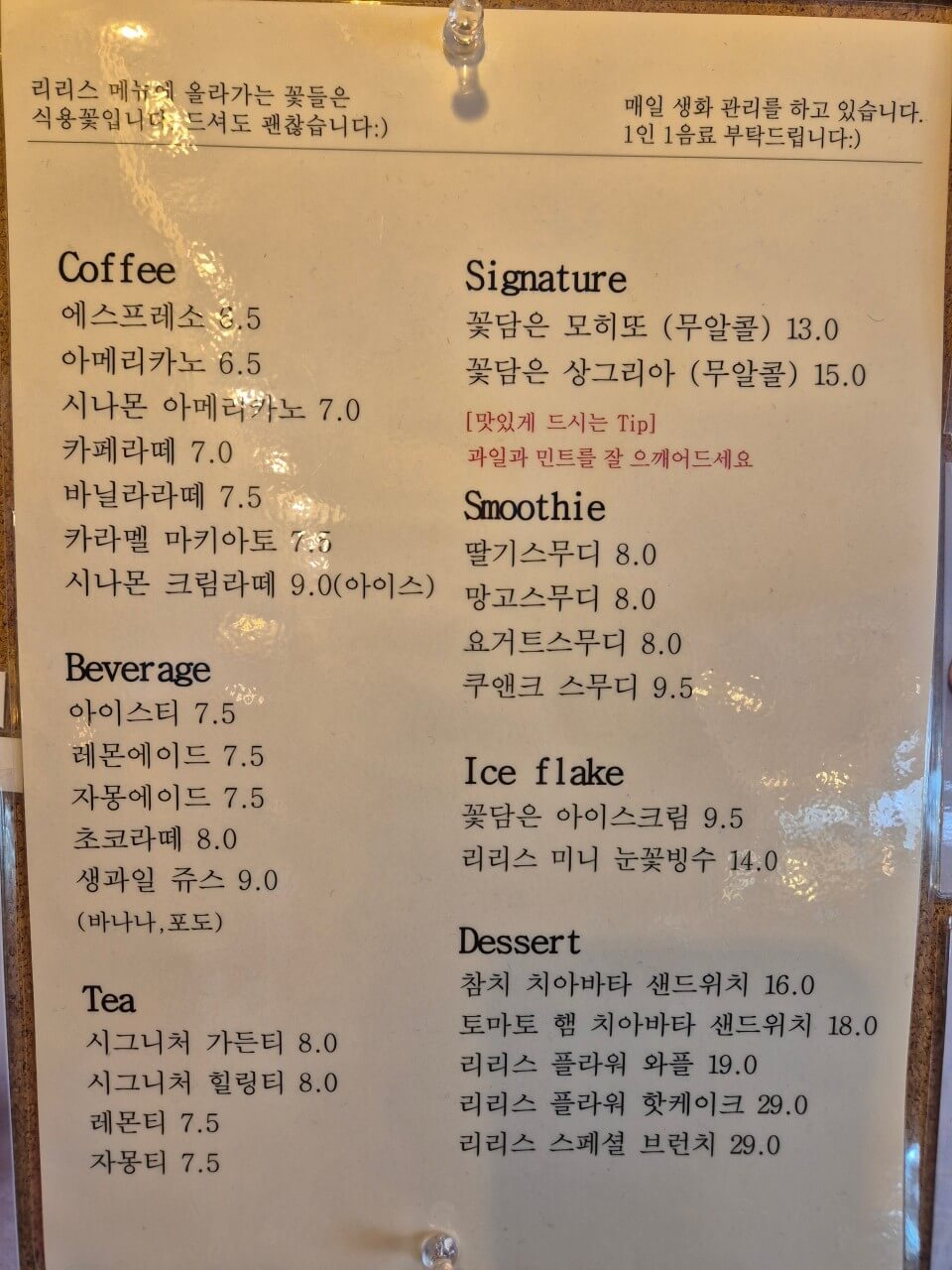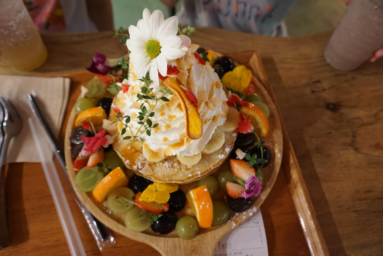 리리스카페는 한 부분이 아니라 카페 전체가 꽃이라고 해도 과언이 아닐 정도로 곳곳에 꽃들이 장식되어 있습니다. 뿐만 아니라 메뉴에도 꽃이 장식되어 있어 먹기 아까울 정도입니다. 오른쪽 사진은 리리스플라워와플입니다.