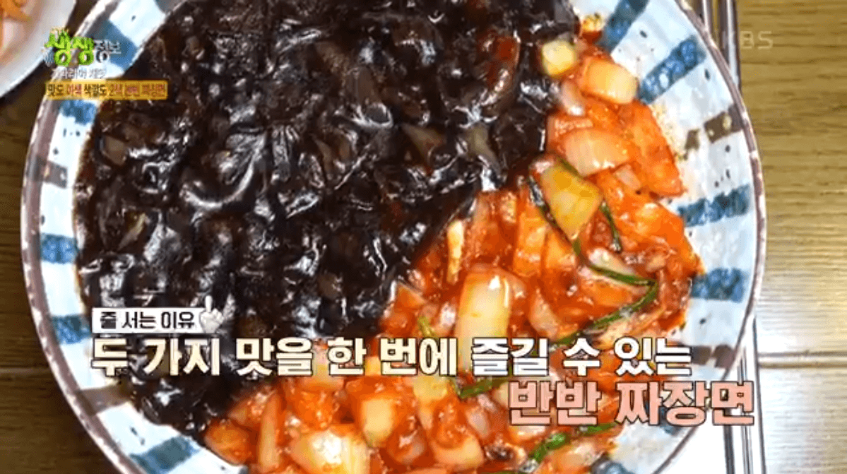 어제인 11월 19일 방송된 2168회 [2TV 생생정보]에는 이색적인 짜장면 맛집이 소개되었다. 긴 줄을 서서 먹어야 되는 만큼 장사가 잘 되는 가게를 소개해주는 코너 <기다려야 제맛>에는 반반 짜장면을 판매하는 중국 음식점이 소개되었는데, 바로 파주에 위치한 안동각이다. 짬짜면은 이젠 흔한 메뉴가 됐지만 매운 양념과 일반 짜장면을 반씩 담아주는 짜장면이라니... 비주얼부터 눈길을 끈다.