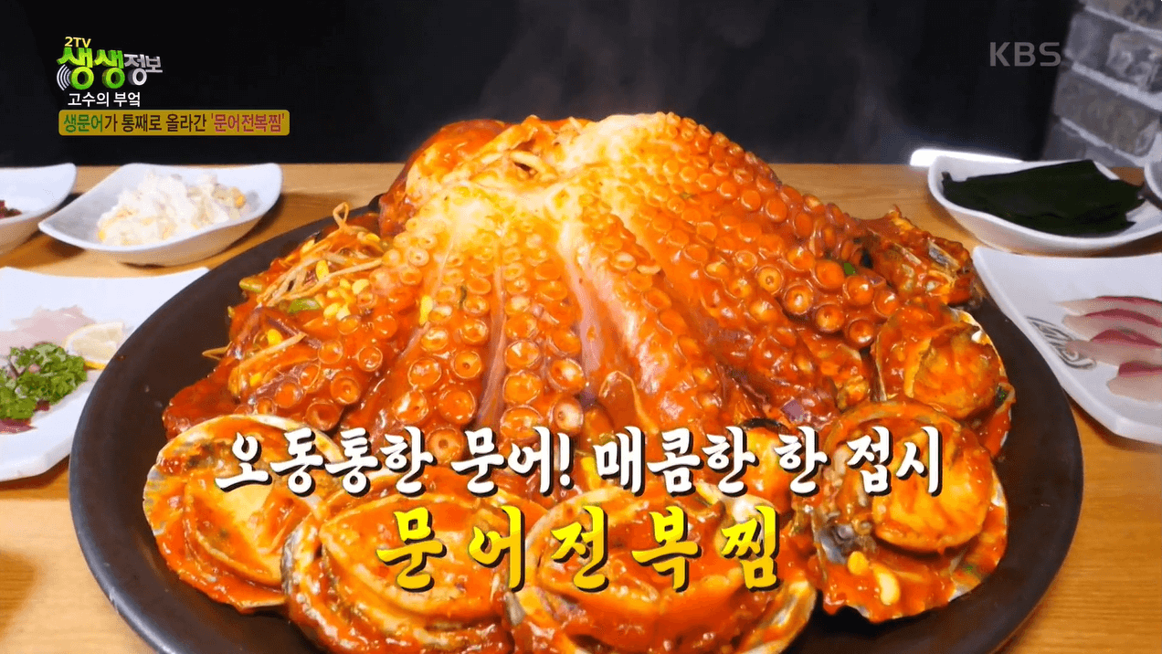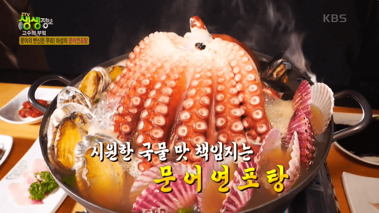 어제, 10월 30일 2154회 [2TV 생생정보]에서는 문어전복찜과 문어연포탕 맛집이 소개되었다. 방송으로 보기만 해도 문어 자태가 어마어마하면서도 맛있게 보이는데, 문어전복찜은 그렇다 쳐도 이름마저 생소한 문어연포탕이라니... 그 맛이 궁금해서라도 <고수의 부엌> 주인공인 속초 만석찜가로 달려가고싶다.